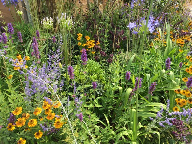 - Naturalistic planting design with evergreens, perennials, annuals and bulbs.